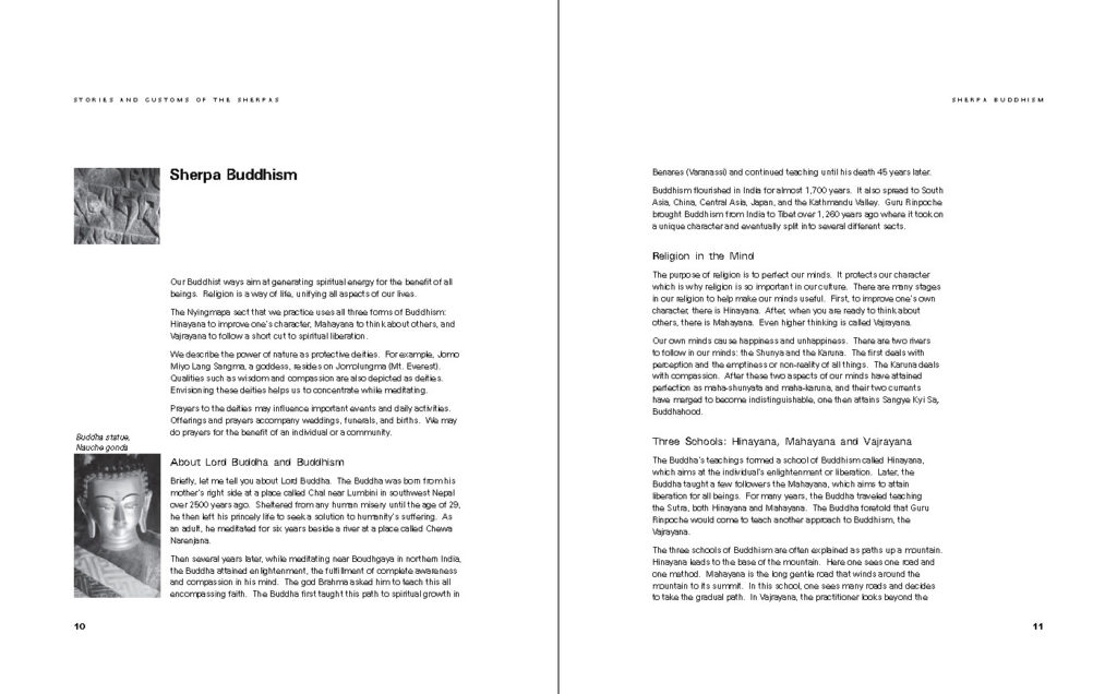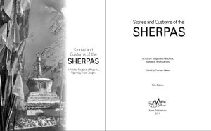 “Visitors from many countries come here to see and to climb Chomolungma, Mt. Everest. Often you want to know about the culture of our Sherpa people. Therefore, we have made this little book of cultural information to help you understand our way of life. We originally made this book through the Sherpa Cultural Centre project at Tengboche monastery in Solu-Khumbu district of East Nepal. I wanted to make a book about the Sherpa’s heritage so people will remember their culture and stories.”